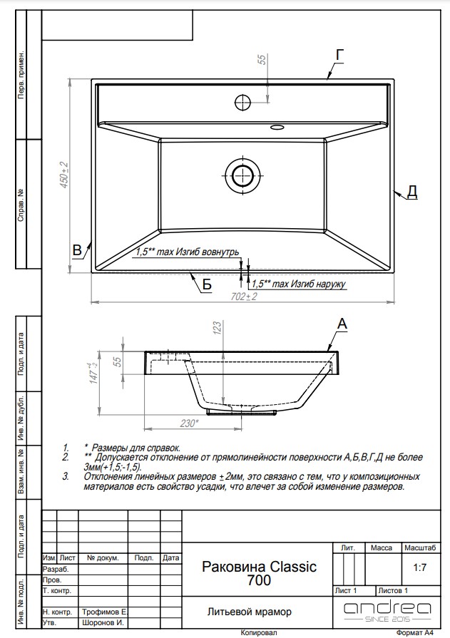 Andrea Раковина Classic, 70 см