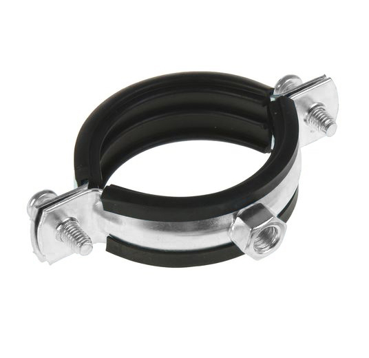Хомут выполнен из оцинкованной стали, которая устойчива к коррозии. Внутренняя часть снабжена профилированной резиновой прокладкой.