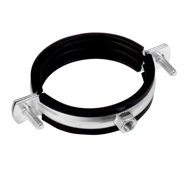 Хомут выполнен из оцинкованной стали, которая устойчива к коррозии. Внутренняя часть снабжена профилированной резиновой прокладкой.