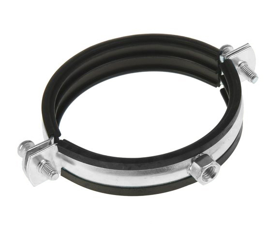 Хомут выполнен из оцинкованной стали, которая устойчива к коррозии. Внутренняя часть снабжена профилированной резиновой прокладкой.