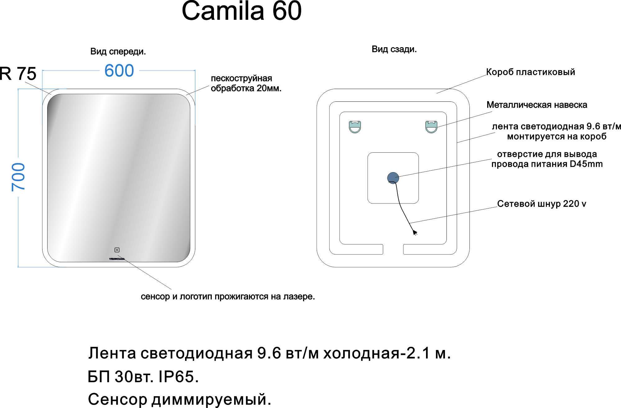 Коллекция CAMILA представляет зеркала с загругленными углами и подсветкой по периметру (холодный свет). Зеркала визуально расширяют границы помещения, создают легкий образ пространства. Грани зеркал ошлифованы, что предовращает возможность порезов.