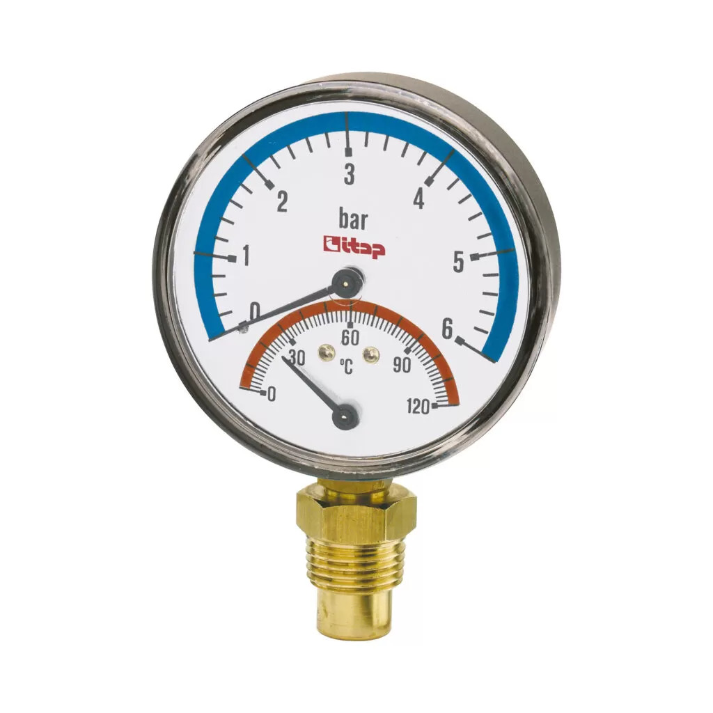Термоманометр Itap устанавливается на коллекторы в системах отопления и водоснабжения. Предназначен для измерения разряжения, давления и температуры газообразных и жидких , не вязких и не кристаллизующихся измеряемых сред, не агрессивных по отношению к медным сплавам.