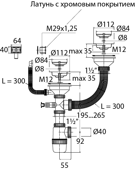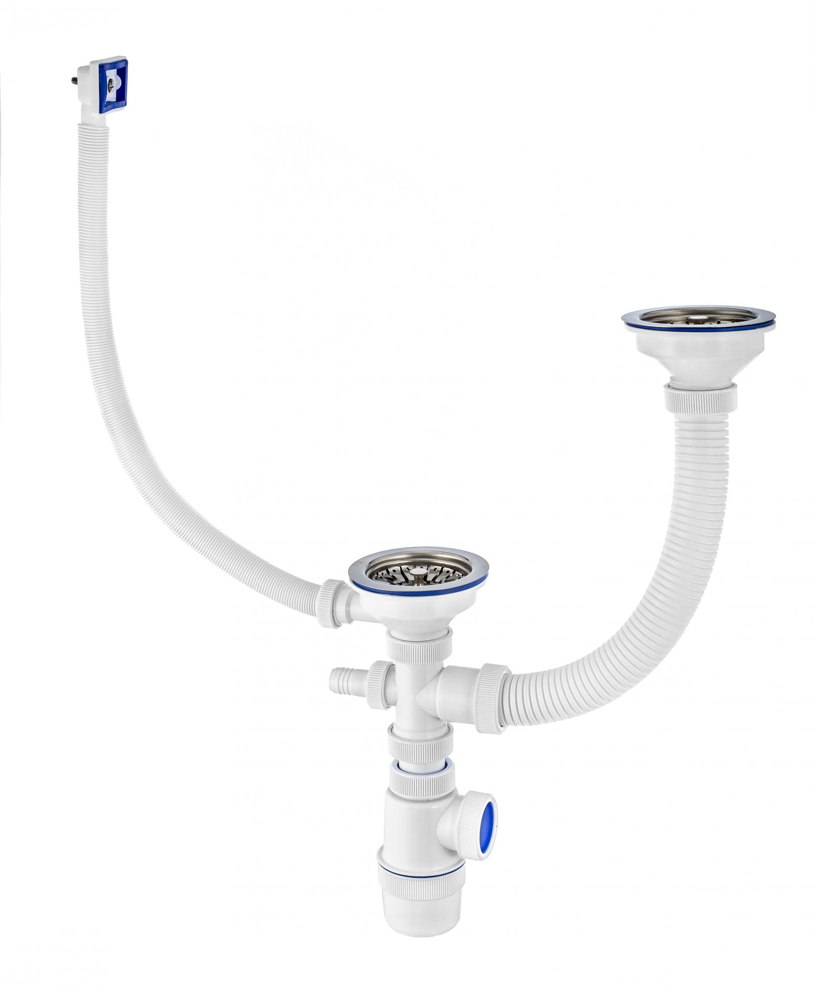Сифон "Элит" с выпусками, отводом и прямоугольным переливом для разноуровневой мойкиКак купить