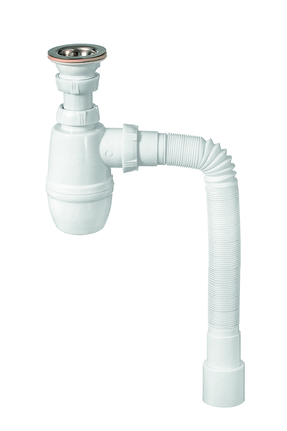 Сифон предназначен для отвода воды из нержавеющих и эмалированных моек, а также чугунных и фаянсовых раковин.