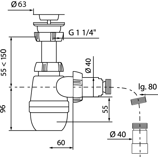 WIRQUIN Сифон «МИНОР» с нержавеющей чашкой, с отводом и с гофротрубой (L800 мм)