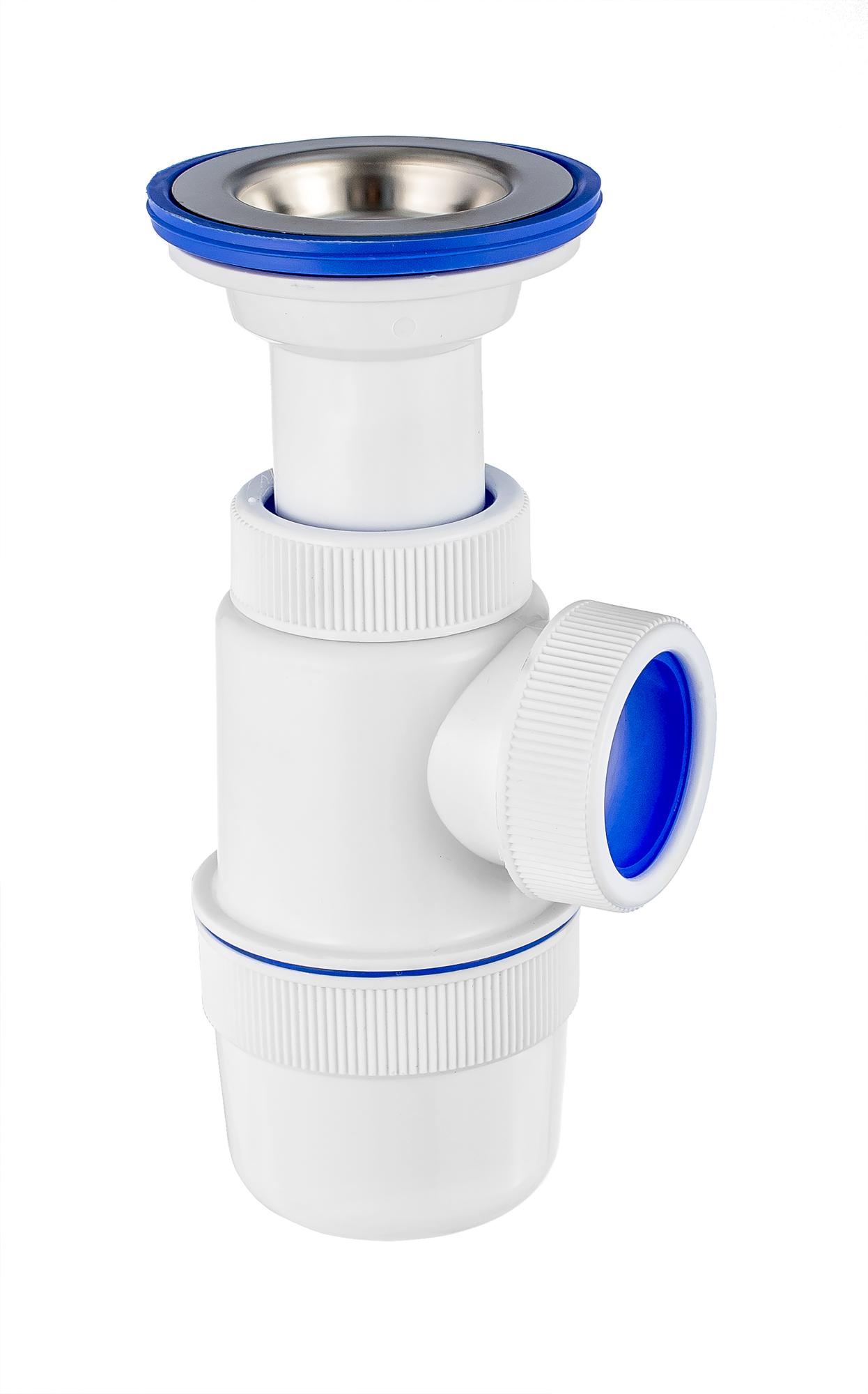 Сифон предназначен для отвода воды из нержавеющих и эмалированных моек, а также чугунных и фаянсовых раковин.