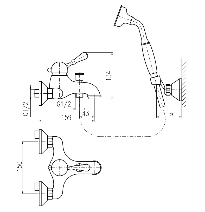 В душевой комплект входит лейка с керамической ручкой, подвижный держатель и шланг.