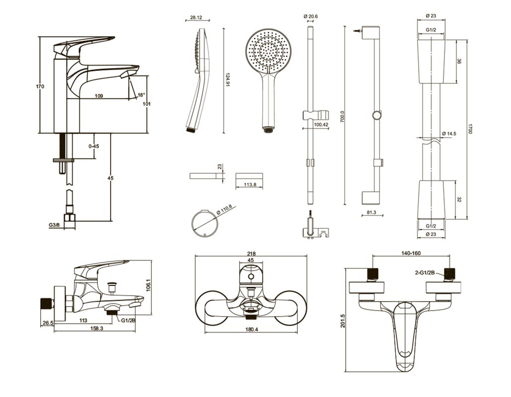 Душевые комплекты Jacob Delafon устанавливаются в стену рядом с душем или ванной. В комплект ELITE входят: два смесителя (настенный и врезной), душевая штанга (высота 70 см), мыльница, держатель, лейка и шланг (170 см). Настенный смеситель имеет встроенный девиатор, автоматически переключающий поток с душа на излив при закрытии воды. Места соединений шланга с лейкой и смесителем оснащены поворотным конусом или специальными подшипниками, которые препятствуют перекручиванию шланга.