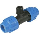 Тройник компрессионный с наружной трубной резьбой является универсальной деталью полиэтиленового трубопровода имеющий наружную резьбу с шагом, соответствующим стандартным размерам стальных труб, благодаря чему, этот тройник можно использовать для перехода с ПНД трубы на стальную и наоборот.