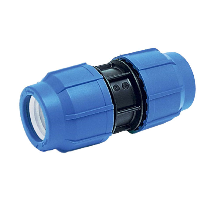 Муфта компрессионная соединительная. Предназначена для обеспечения надежного соединения двух полиэтиленовых труб равного диаметра между собой, при строительстве систем питьевого или технического водопровода, систем напорной или безнапорной канализации, для устройства кабельных каналов из ПНД труб с рабочим давлением до 16 атмосфер для труб диаметром от 20мм до 63мм.