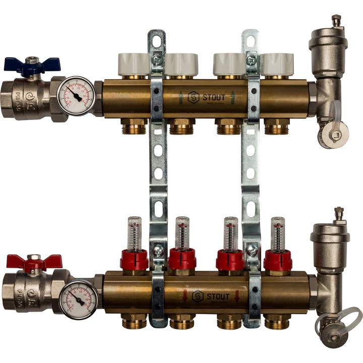 STOUT Коллектор в сборе с расходомерами 4 выхода, латунь